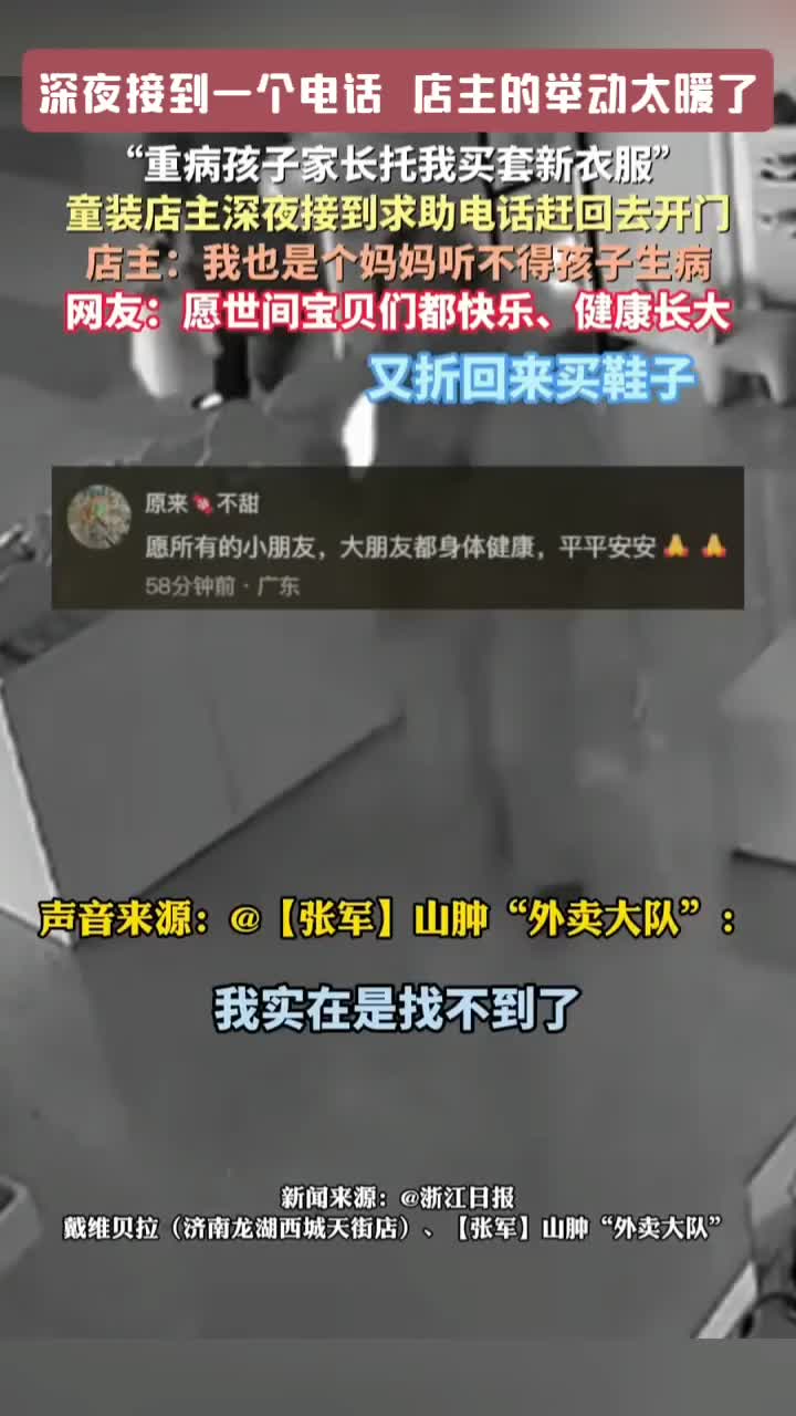 山东济南一位童装店主接到一个求助电话,一位肿瘤患儿病重,家人急需买一套新衣服。当时已接近深夜十二点,店主二话没说赶回去开门,亲自挑选搭配了一套新衣新鞋。店主说“我也是个妈妈,听不得孩子生病。”