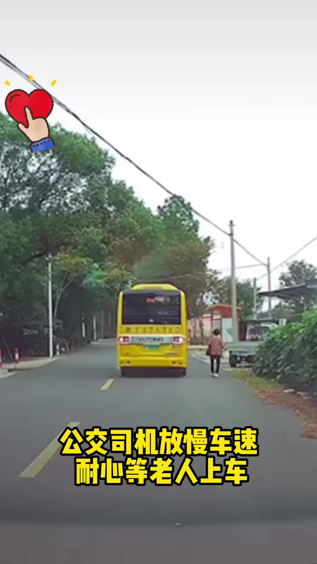 浙江省嘉兴市的乡间道路上,一名老奶奶提着包、拎着桶慢慢走向公交站,公交车就在她身后不慌不忙地跟着,司机全程没按喇叭,直至老奶奶走到站台上车。