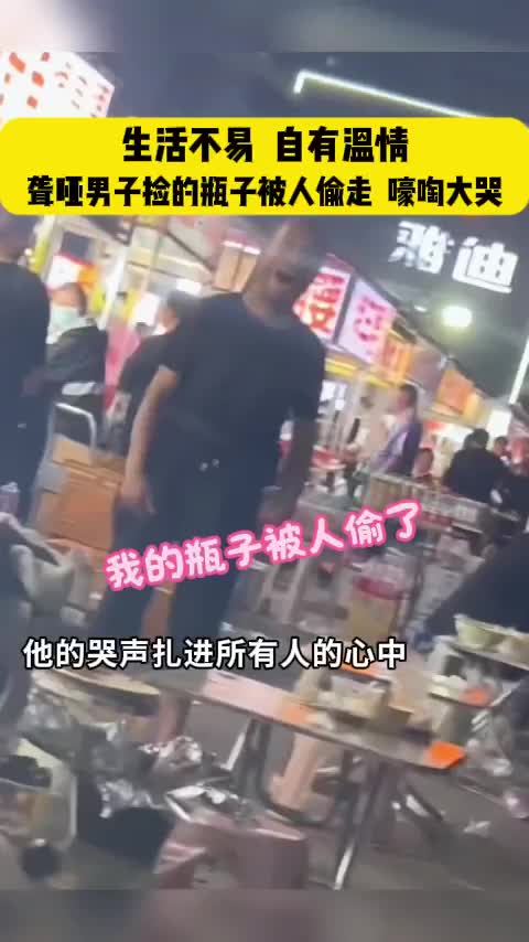 聋哑男子长期在夜市帮摊主收拾垃圾、端菜,摊主将可变卖的空瓶等废品留给他。某日男子在忙碌时,捡拾的酒瓶被另一名收垃圾者抢走,因无法沟通,他只能站在原地崩溃大哭。但好在有暖心的陌生人递上空瓶安慰,这正是人间温情的体现。