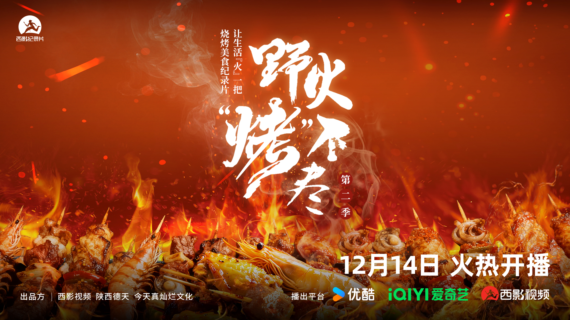 美食纪录片《野火“烤”不尽》第二季于12月14日在优酷、爱奇艺、西影视频上线,每周更新一集,由西影视频、陕西德天、北京今天真灿烂文化共同出品。继第一季热播之后,本季延续“烧烤江湖见市井百态”的核心视角,以更贴近真实的观察、更沉浸生动的叙事、更契合当代审美的呈现方式,深入街头巷尾,在炙烤烟火中记录普通人的生活轨迹与生命温度。