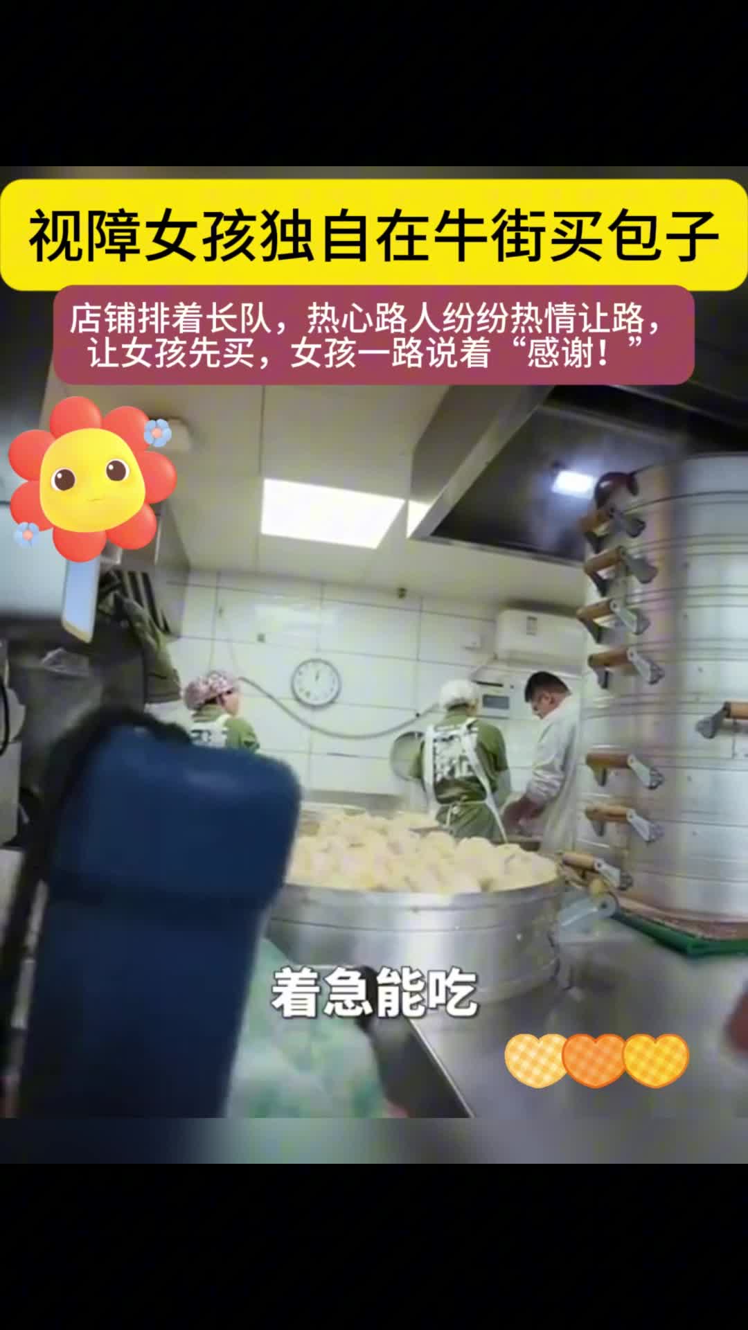 一名视障女孩独自买包子,店铺门口排着长队。热心大爷看到女孩后,热情地跟女孩说自己可以帮着买,女孩表示插队不太好准备去排队,队伍里善良的人们都说没关系的,让其先买。
