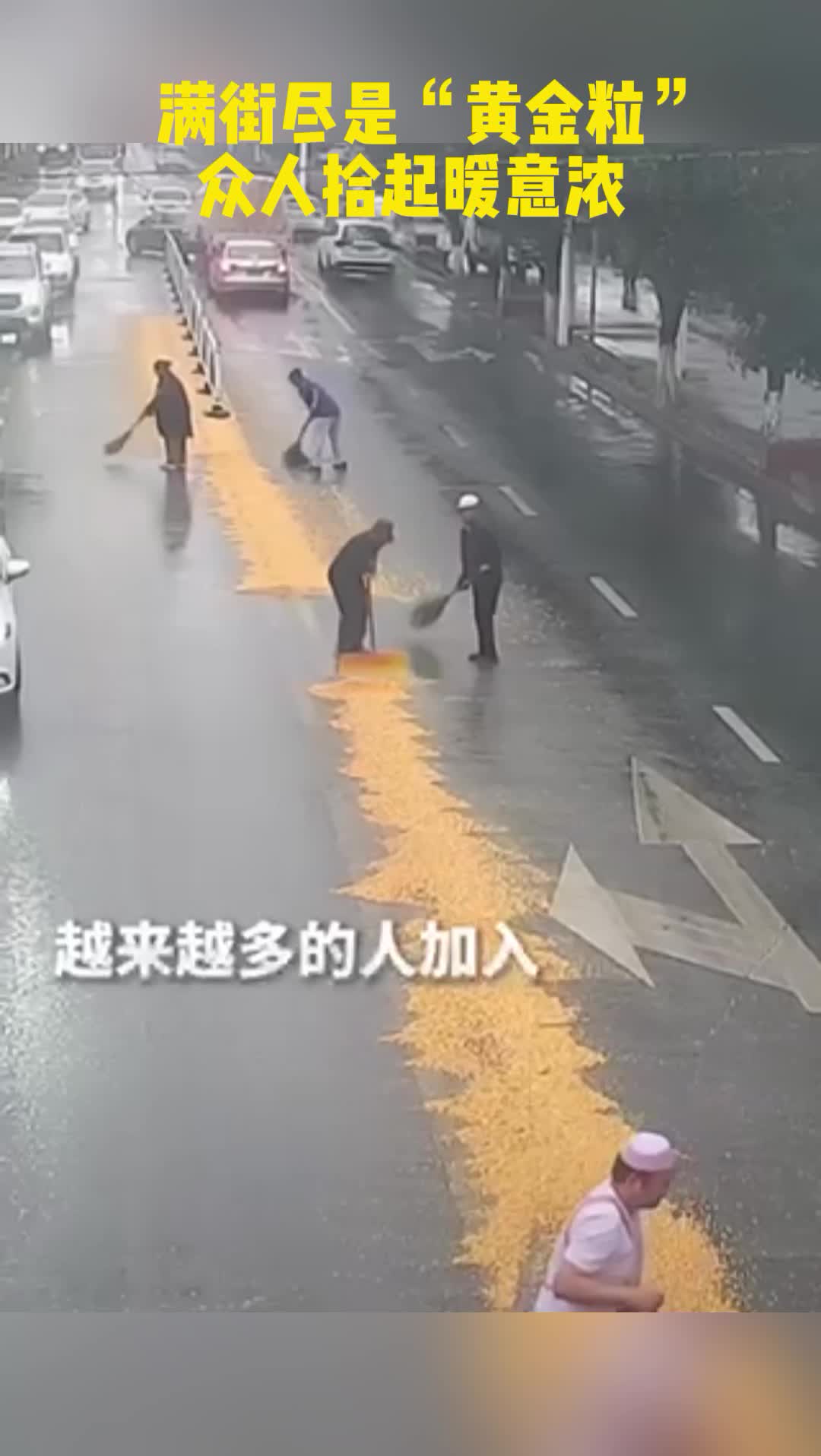 货车满载玉米粒不慎散落一地热心路人纷纷自发帮忙