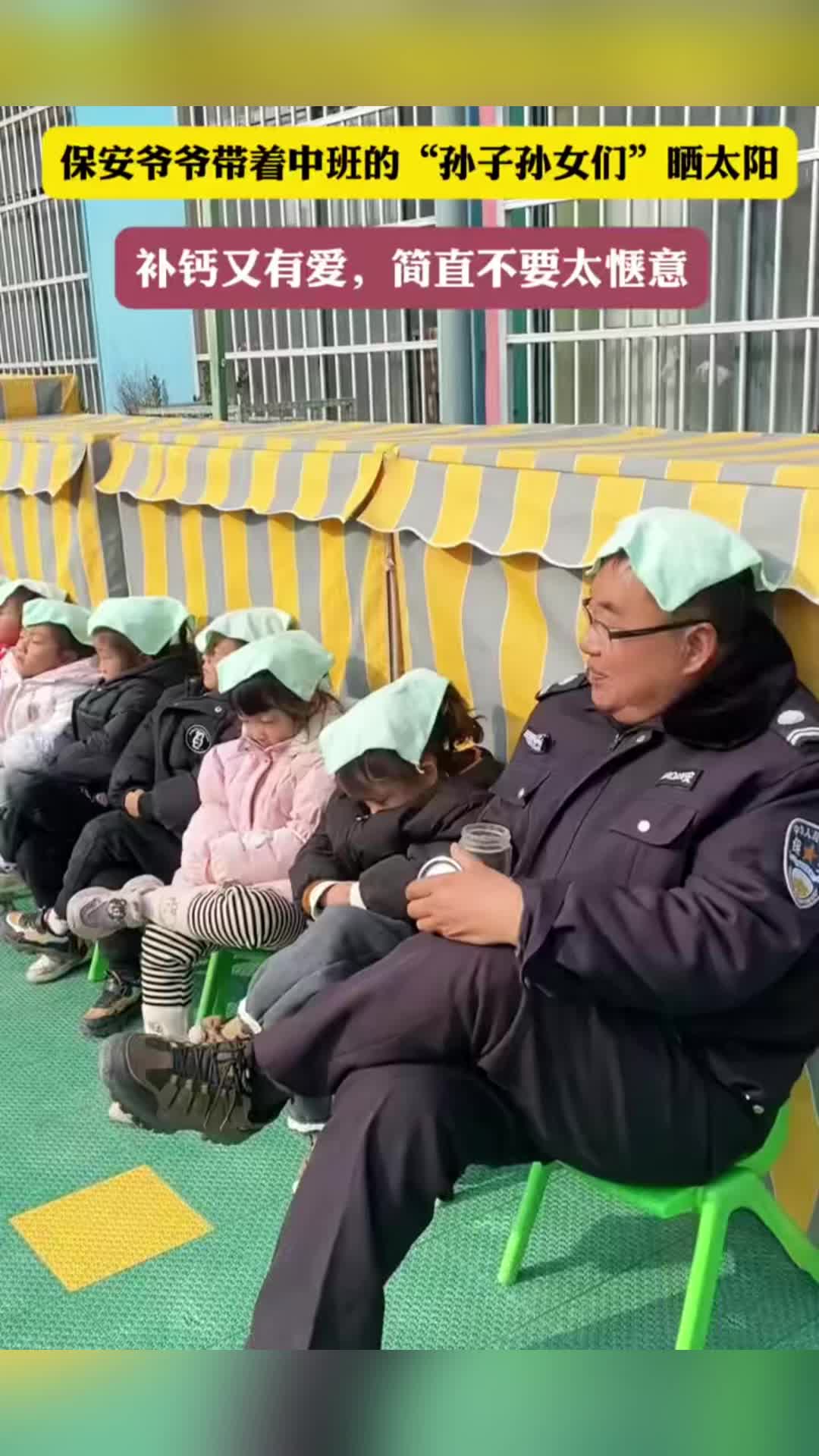 保安爷爷带着中班的“孙子孙女们”晒太阳 补钙又有爱 简直不要太惬意