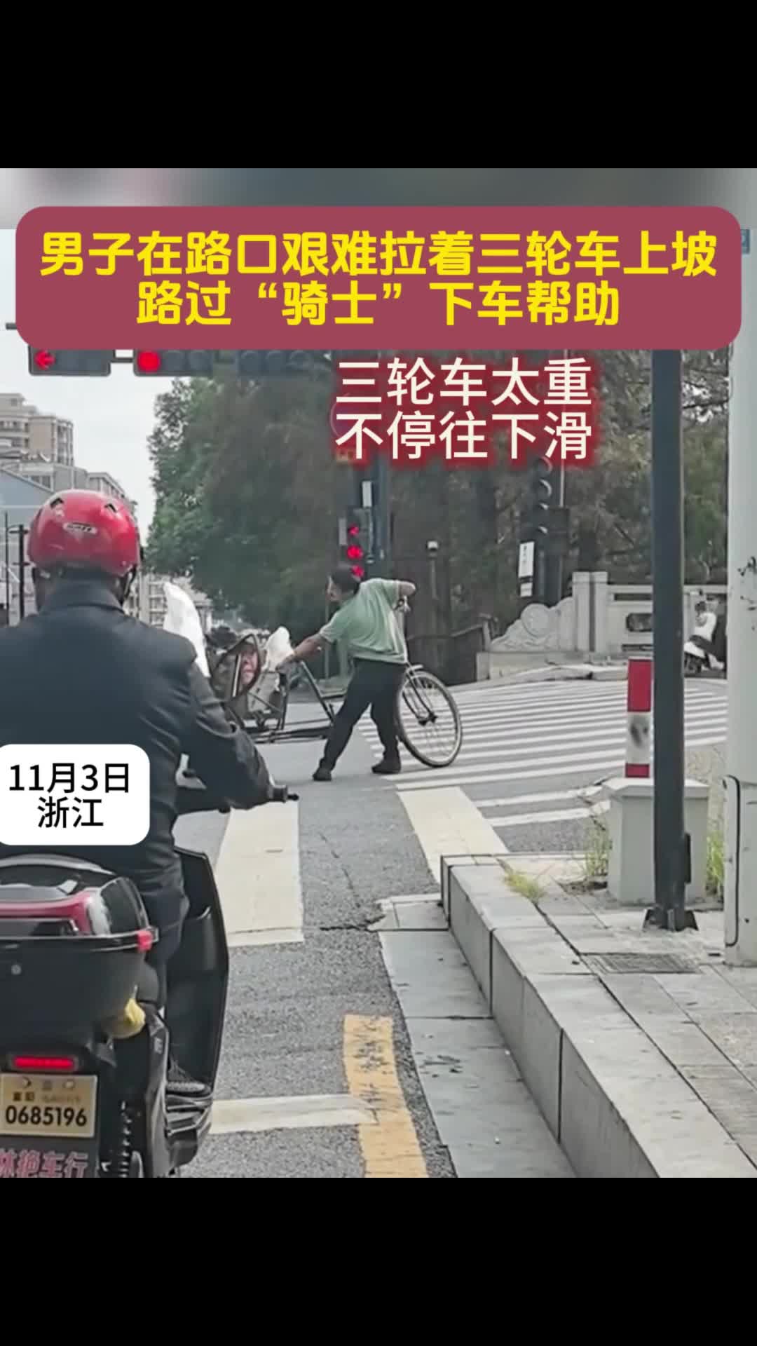 11月3日,一浙江网友记录十字路口的暖心瞬间:承载重物的三轮车难以上坡,一名骑车路过的男子见状后停车,下车帮三轮车车主一起推车,助其顺利上坡。网友:真切的善良是演不出来的,好人一生平安。