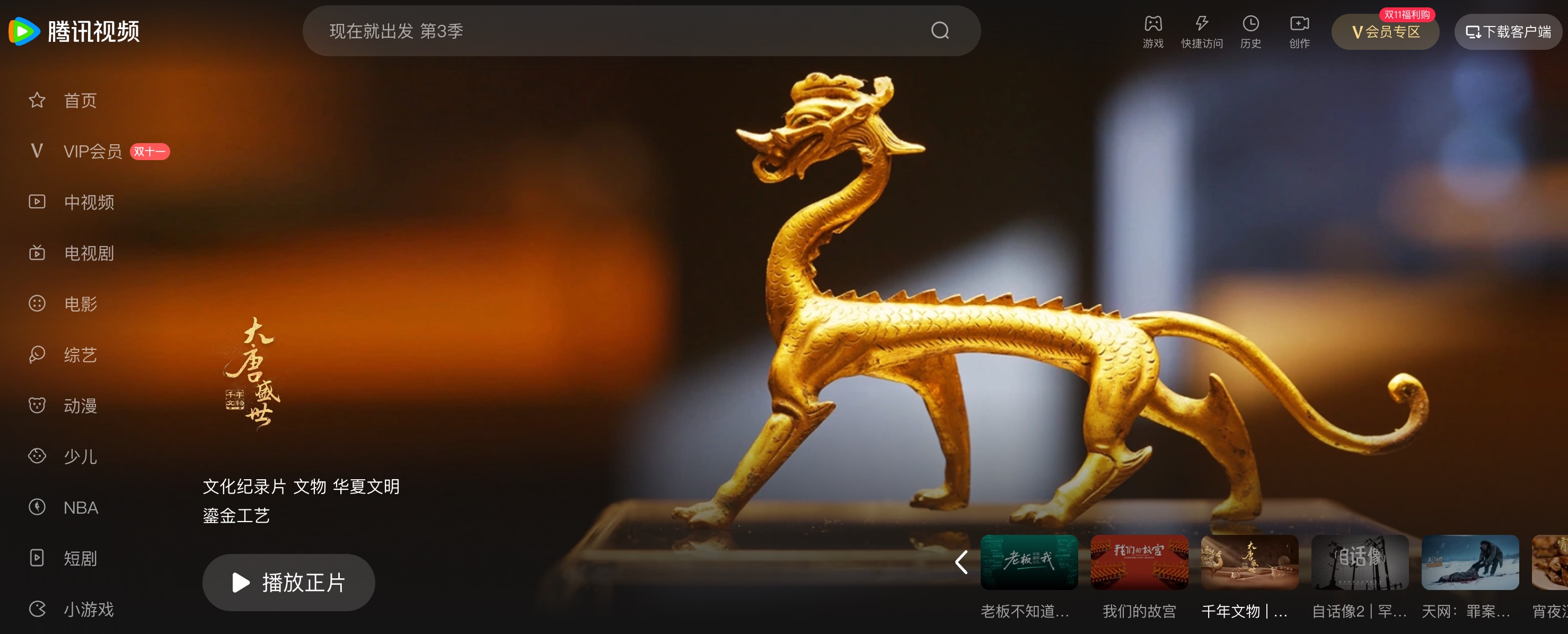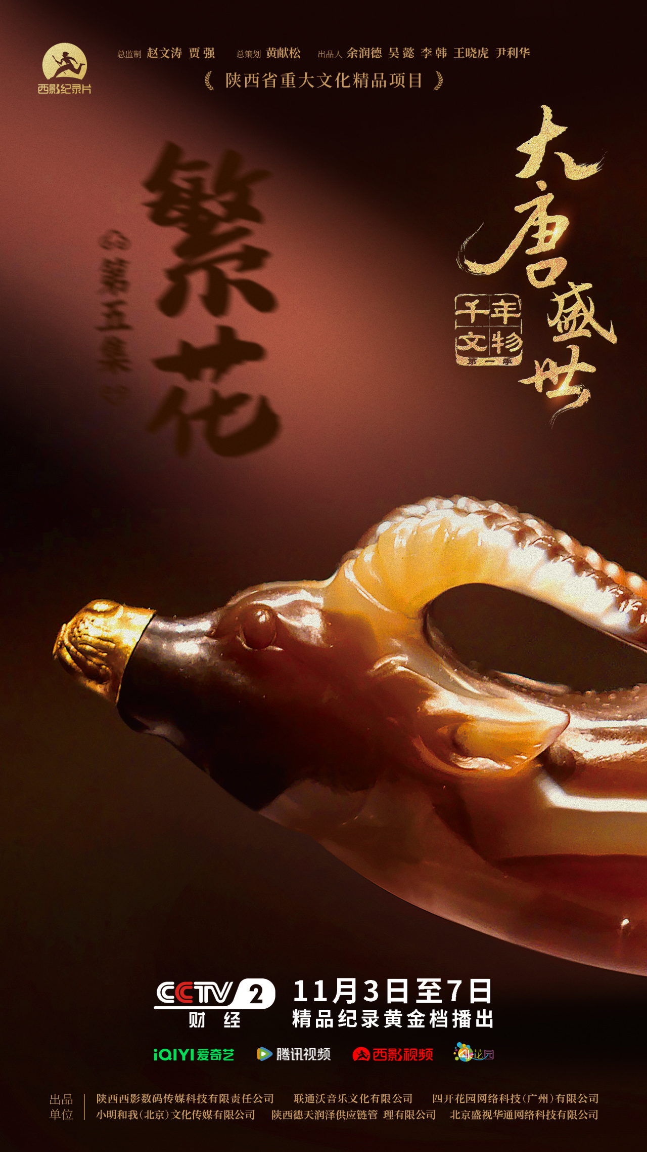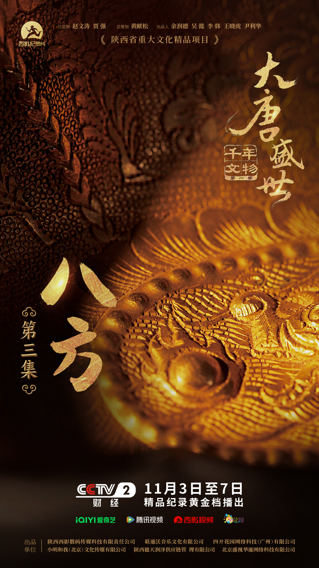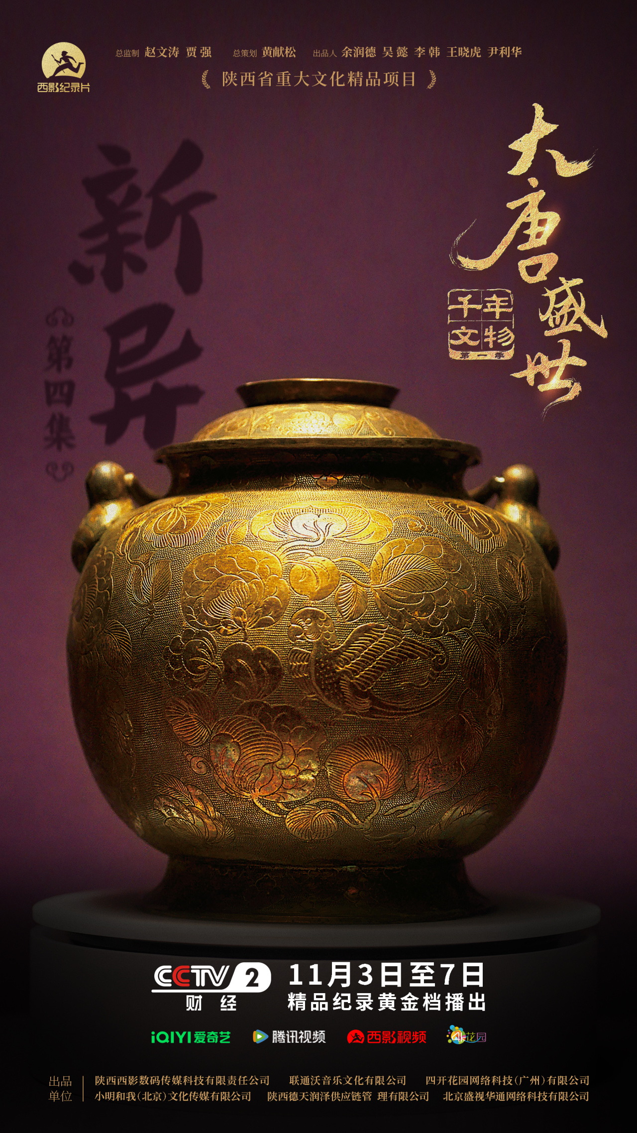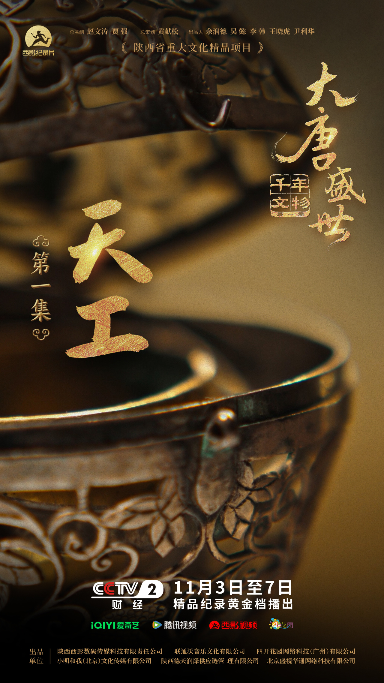 《千年文物·大唐盛世》自11月3日在CCTV-2首播后,迅速引发各界热烈反响。该片于今日(11月5日)起,在爱奇艺、腾讯视频、西影视频、4K花园平台同步上线,每周三18:00更新一集,带您沉浸式感受那个开放包容、气象万千的大唐盛世。