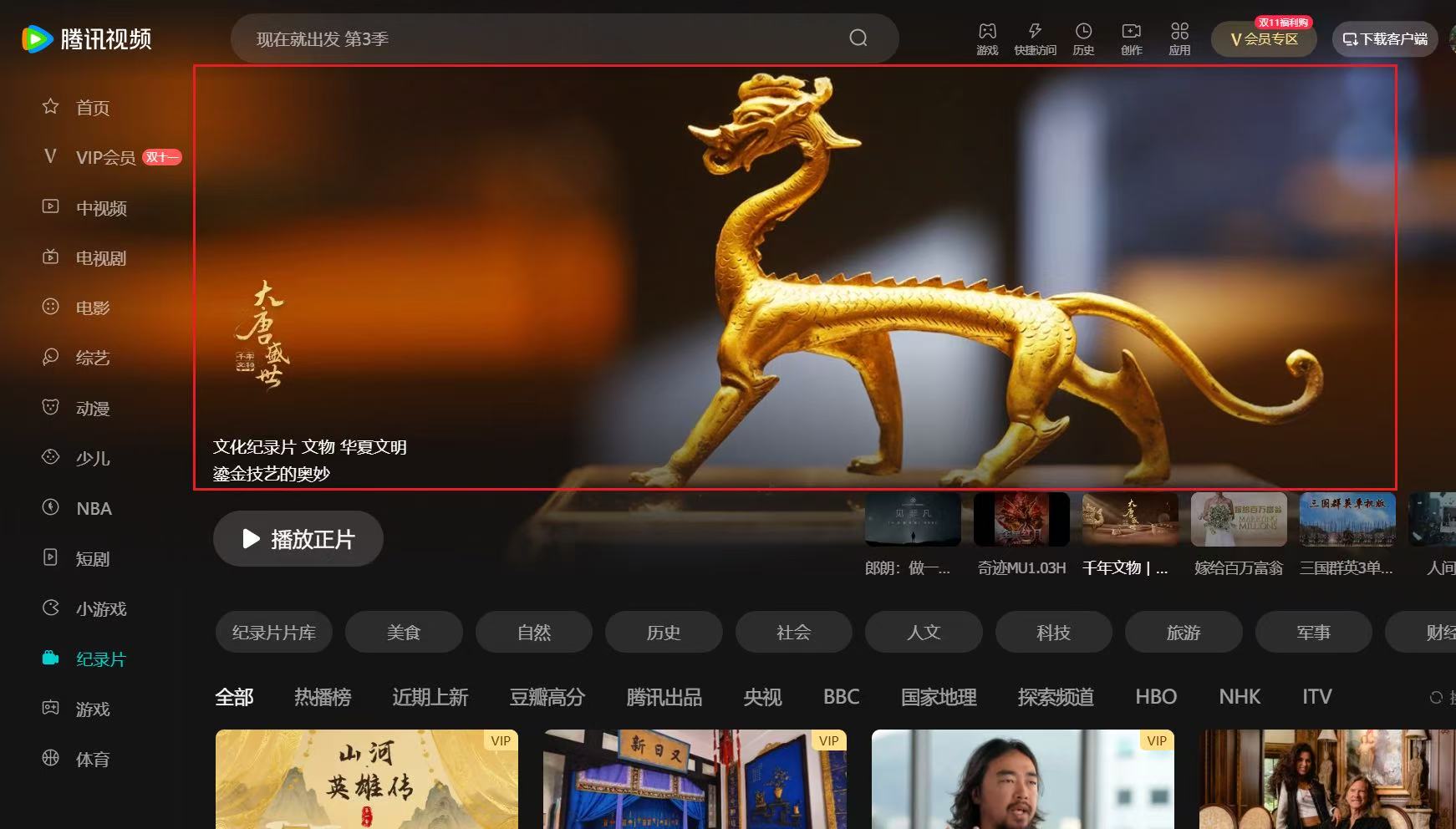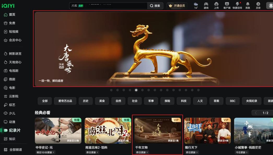 腾讯视频纪录片人文榜第一、爱奇艺纪录片历史榜第三