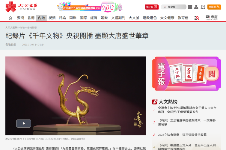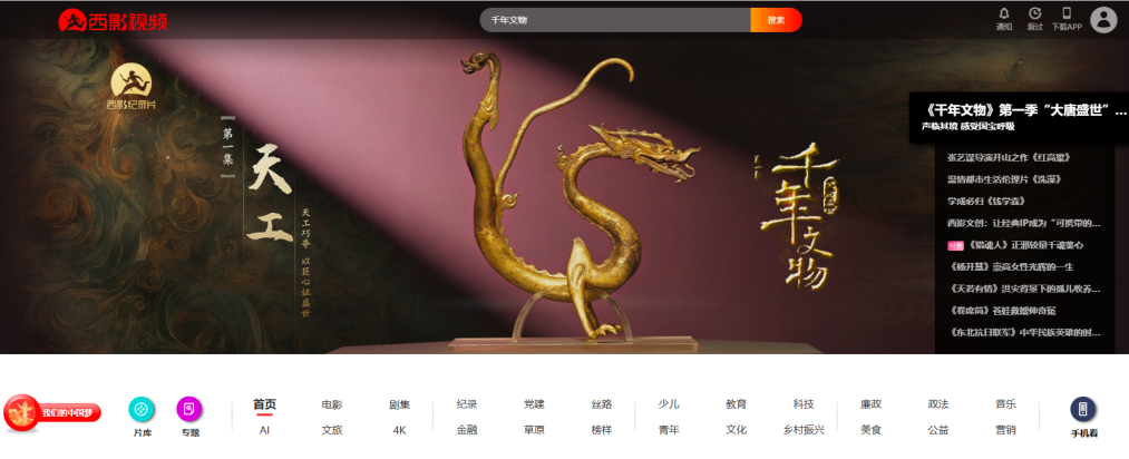 近日,大型历史文物纪录片《千年文物·大唐盛世》在CCTV-2首播收官,并登陆爱奇艺、腾讯视频、西影视频、4K花园等平台持续播出,迅速登上爱奇艺纪录片历史榜第三、腾讯视频纪录片人文榜第一,掀起一场跨越时空的文博热潮。该片联合陕西历史博物馆、陕西省考古研究院、西安博物院等数十家文博机构,集结300余件国宝级文物,借助创新影像技术为文物建立“视觉生命档案”,成功构建起线上线下联动、全域覆盖的纪录片传播新矩阵。