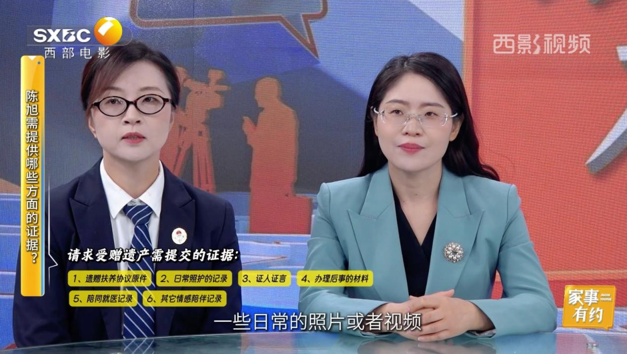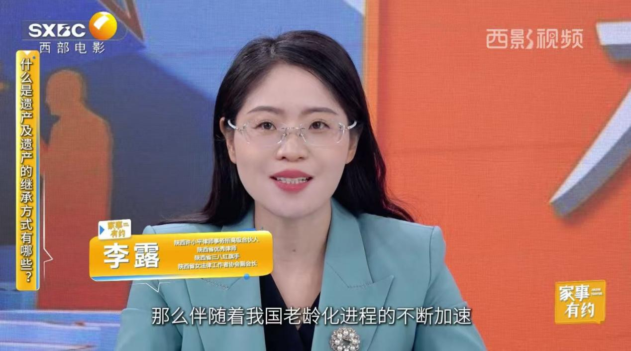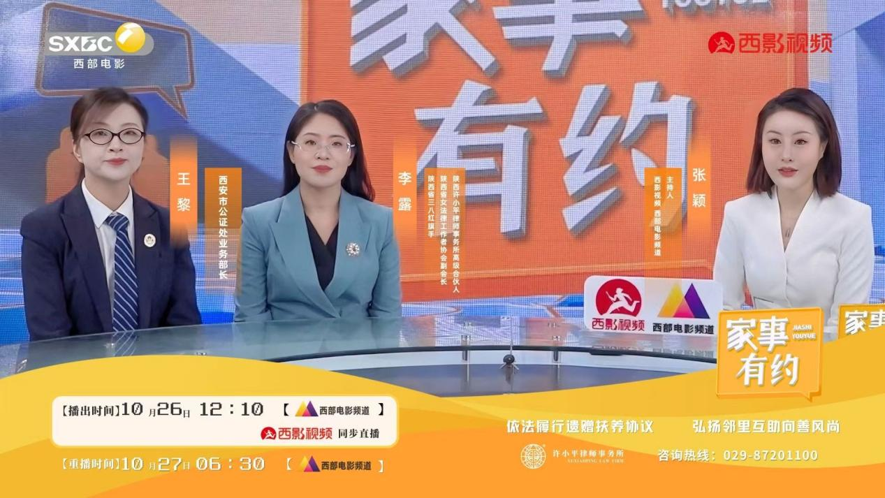 由西影传媒主办的聚焦婚姻家事融媒体普法访谈栏目《家事有约》第二季,由陕西许小平律师事务所特约播出。本期节目以“依法履行遗赠扶养协议 弘扬邻里互助向善风尚”为主题,特别邀请陕西许小平律师事务所高级合伙人、陕西省三八红旗手、陕西省女法律工作协会副会长李露,西安市公证处业务部长王黎做客演播室以案说法。