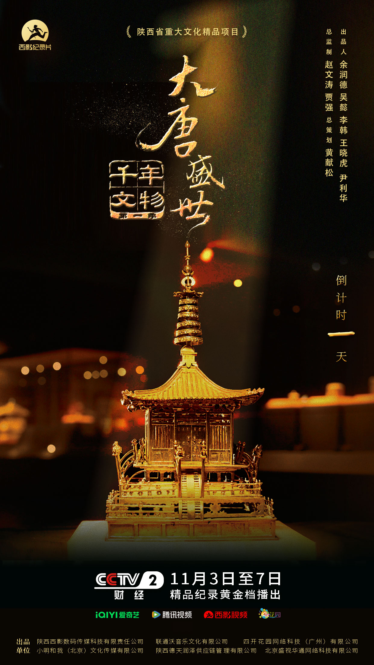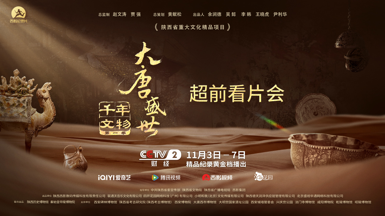 《千年文物》第一季“大唐盛世”于11月3日在CCTV-2精品纪录黄金档开播,11月5日在爱奇艺、腾讯视频、西影视频、4K花园同步上线。作为陕西省重大文化精品项目,该片以文物为线索,运用8K技术全景展现唐代辉煌成就与多元审美,带领观众穿越千年,感受盛世风华。