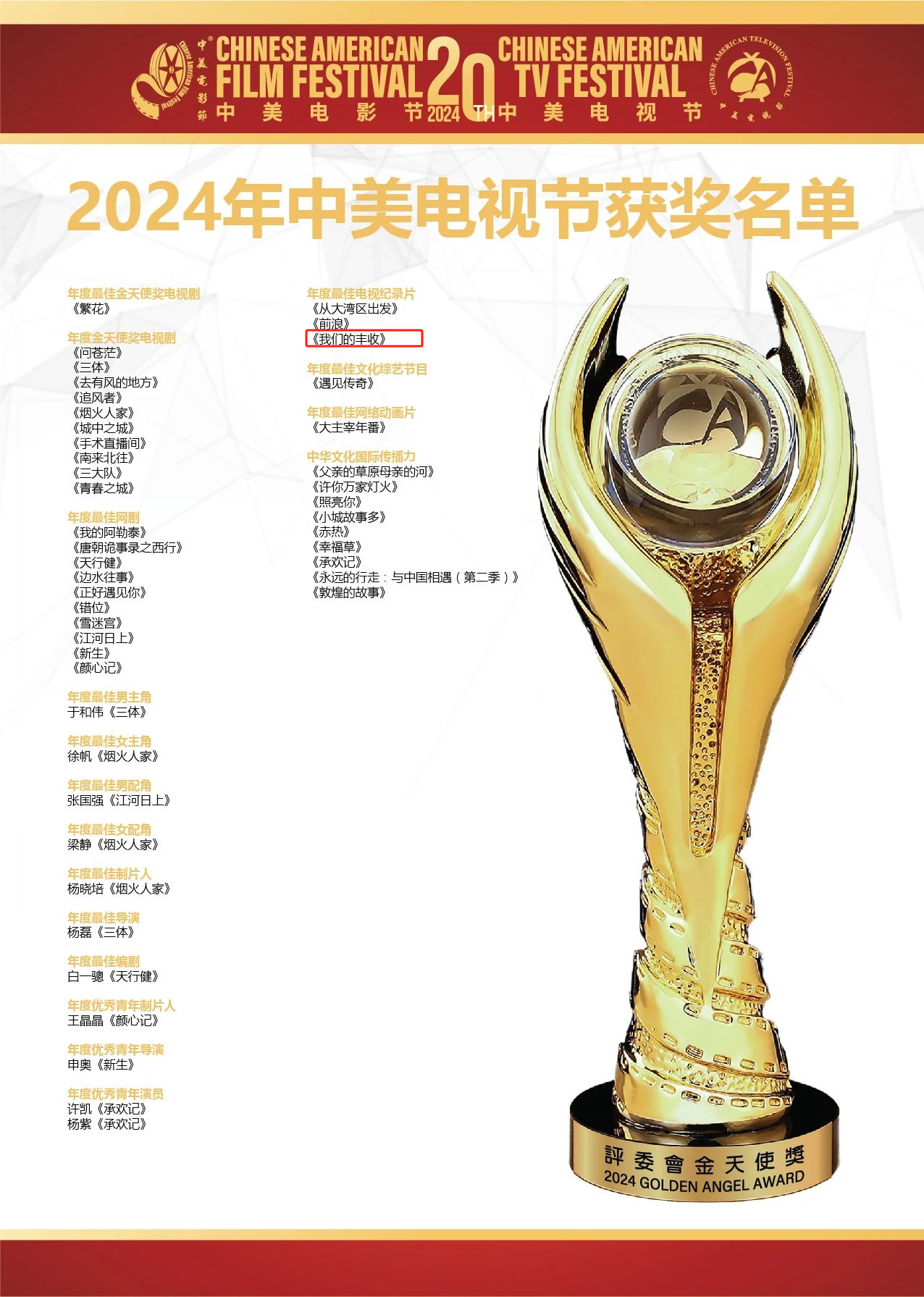 近日,第20届中美电影节和中美电视节开幕式暨“金天使奖”颁奖典礼在美国洛杉矶举行,中美影视界人士、政府官员、各界代表等700余人参加,中国驻美国大使谢锋、中国驻洛杉矶总领事郭少春发表致辞。西影纪录片《我们的丰收》获得年度最佳电视纪录片奖。