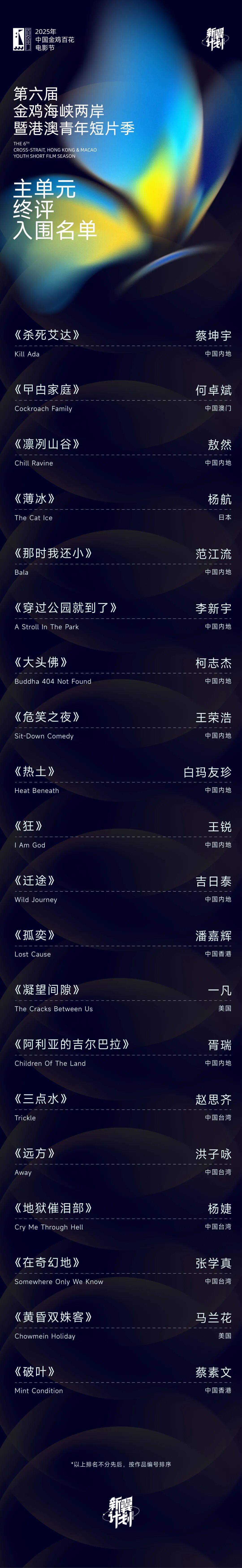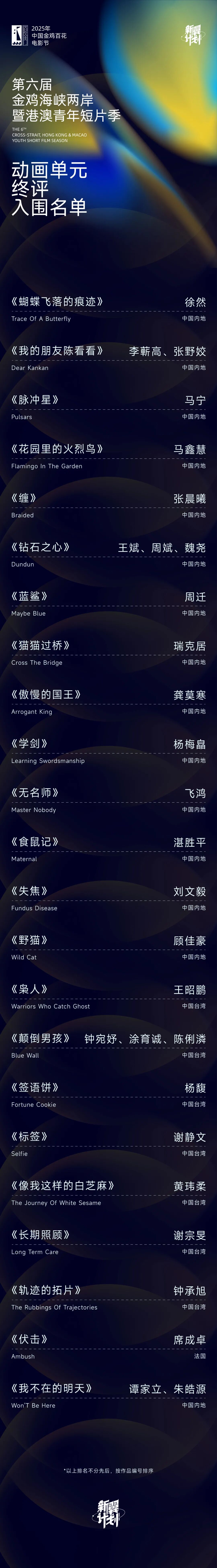 第六届金鸡海峡两岸暨港澳青年短片季(以下简称 “短片季”)复评工作已正式落幕。经评委缜密评选、多轮深入讨论,最终确定主单元20部、动画单元23部作品进入终评。