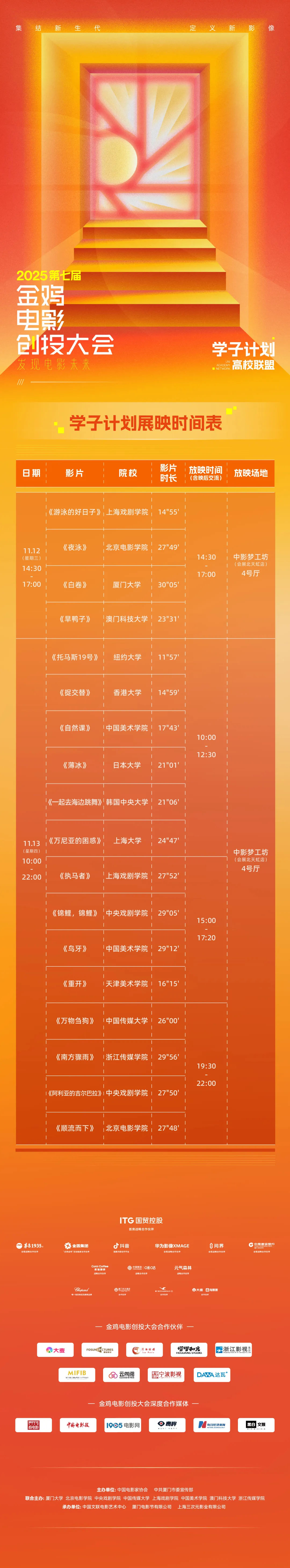 在中国著名导演、监制、编剧,厦门大学电影学院院长黄建新先生的发起下,“高校联盟学子计划”正式推出。该计划以“寻找电影赤子”为口号,携手厦门大学、北京电影学院、中央戏剧学院、中国传媒大学、上海戏剧学院、中国美术学院、澳门科技大学、浙江传媒学院共八大院校,发挥金鸡创投平台优势,通过系统化的培育机制,构建完整的电影人才成长路径,推动中国电影事业持续发展。