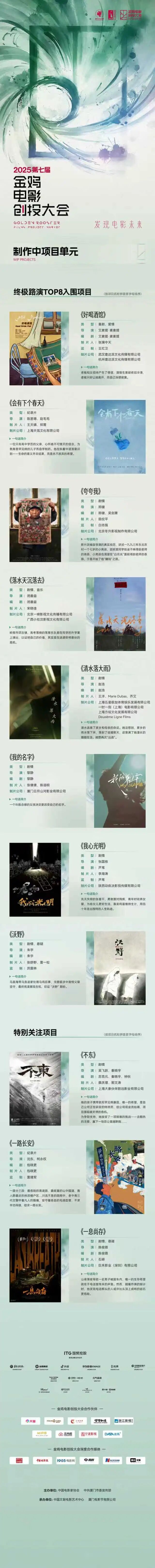 2025年第七届金鸡电影创投大会将于11月11日至11月15日,在厦门天元酒店举办「主单元」、「科幻片单元」、「制作中项目单元」、「金盾计划」终极路演,【报晓】产业放映、推介仪式等活动。邀您与我们一起,在制作中项目(WIP)单元聆听更多动人的初啼,见证更多梦想的绽放!