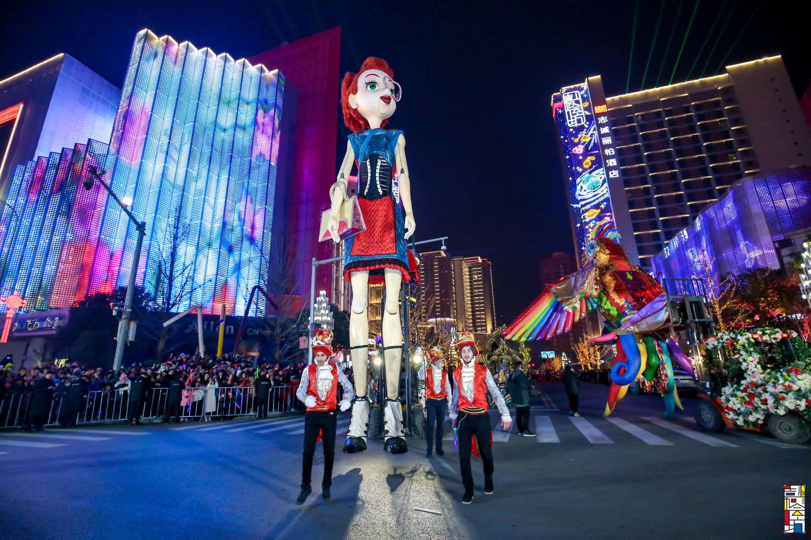 在现场,嘉会坊被五光十色的“声光电”勾连成科幻奇趣的世界。在盛大的西班牙女王花车巡游活动中,西班牙著名创意大师MIGUEL ANGEL 设计的巨人木偶萝拉也来了,“她”是一个在西班牙等国非常流行的巨型展偶,可随时变身,或是时尚女郎,或是民族姑娘。萝拉大眼睛长睫毛,身高9米,手脚可模仿人类行走,还可以根据要求定制妆容、服饰和语言,形象十分可爱。